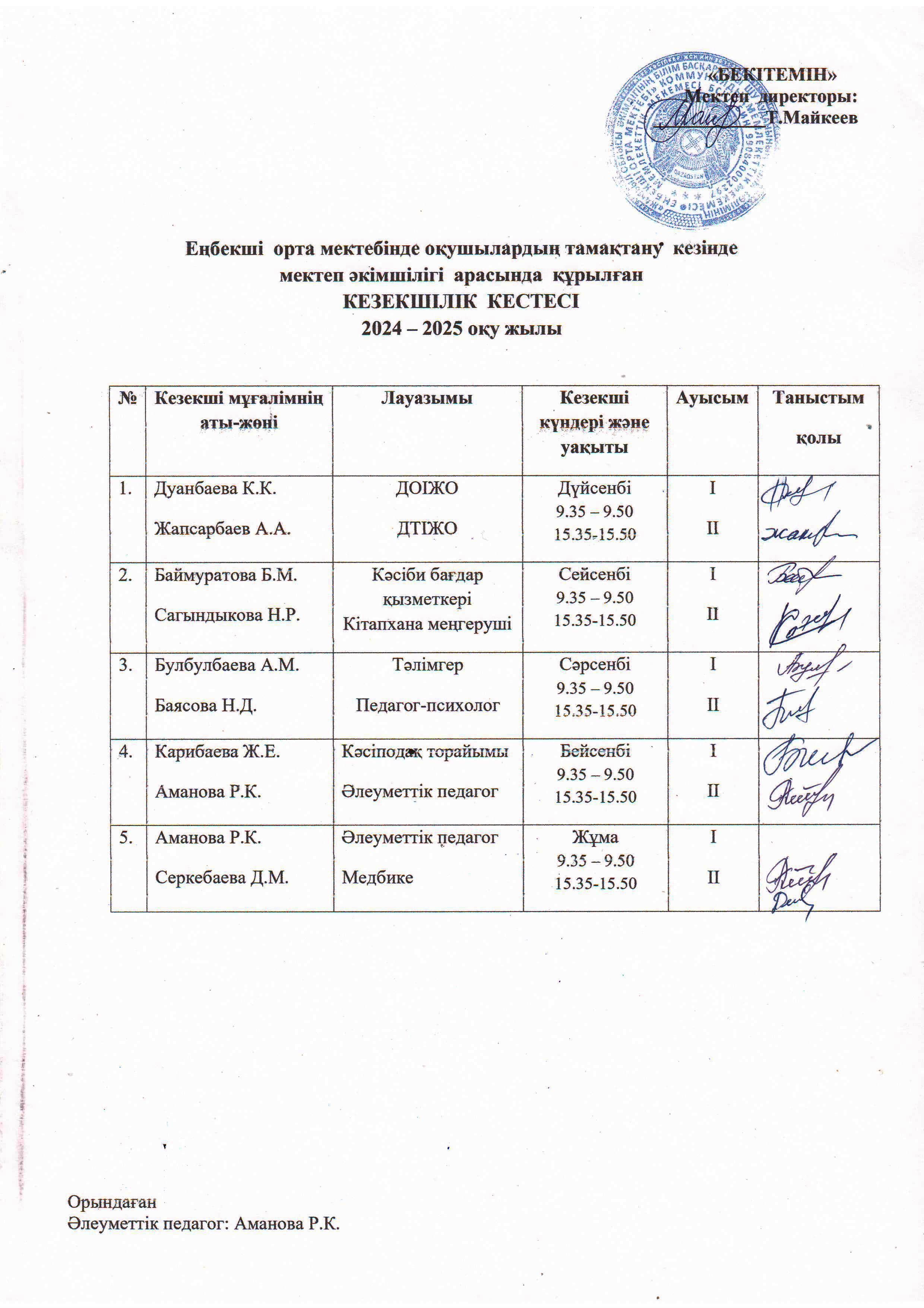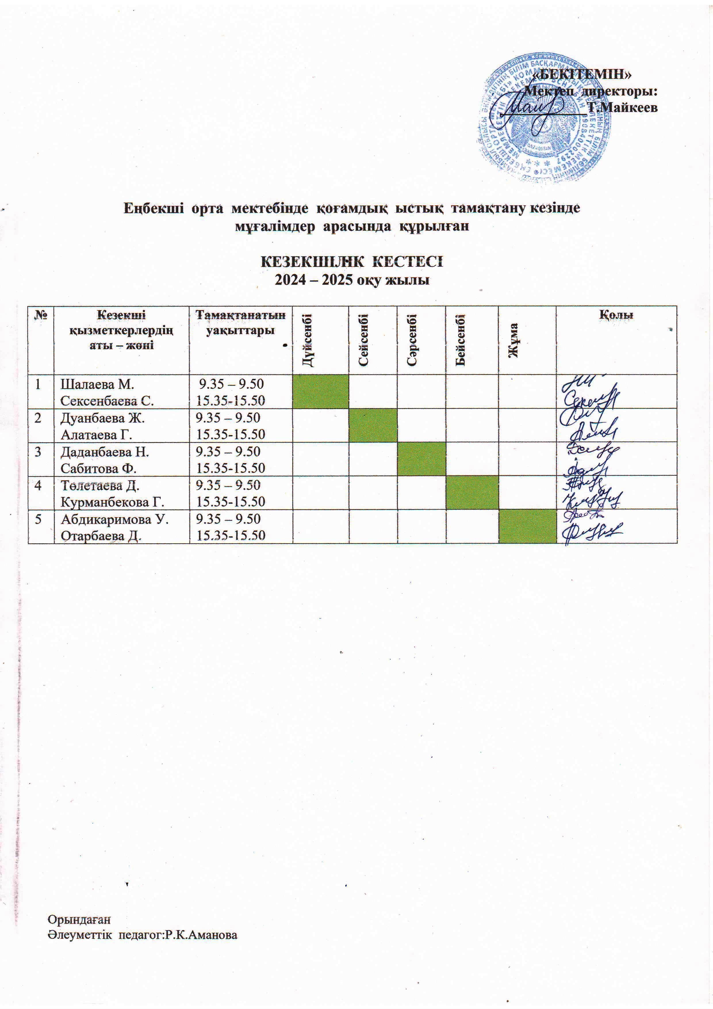 МЕКТЕП АСХАНАСЫНДА ТАМАҚТАНУ ЖӘНЕ КЕЗЕКШІЛІК КЕСТЕЛЕРІ » Еңбекші орта мектебі