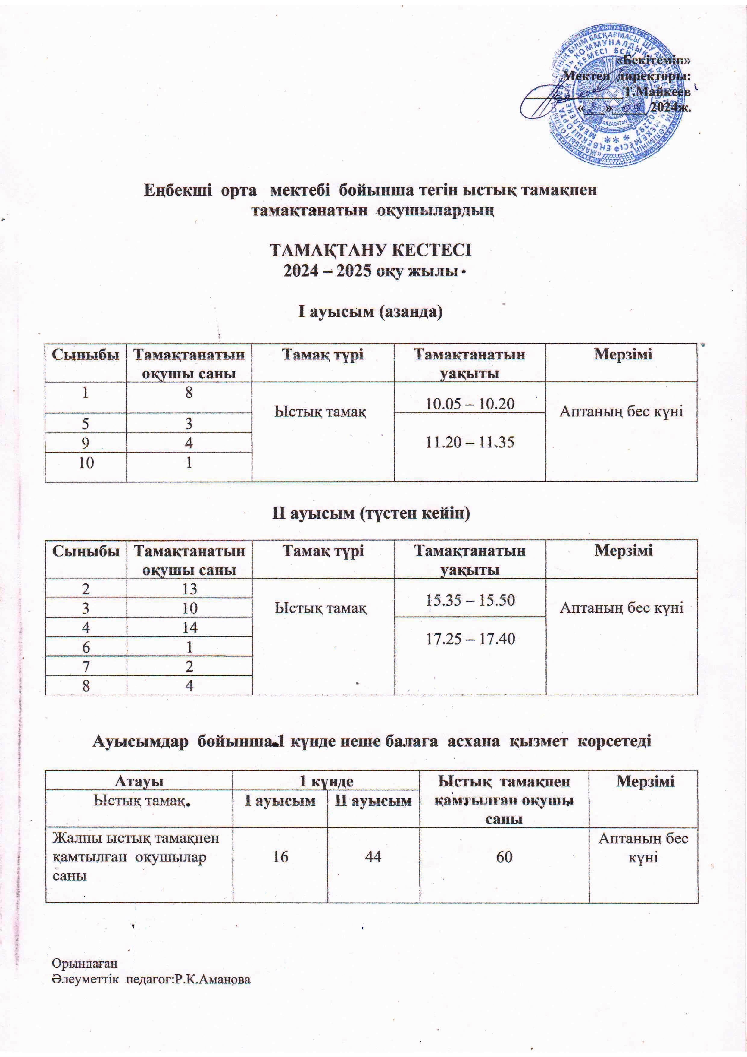 » » МЕКТЕП АСХАНАСЫНДА ТАМАҚТАНУ ЖӘНЕ КЕЗЕКШІЛІК КЕСТЕЛЕРІ