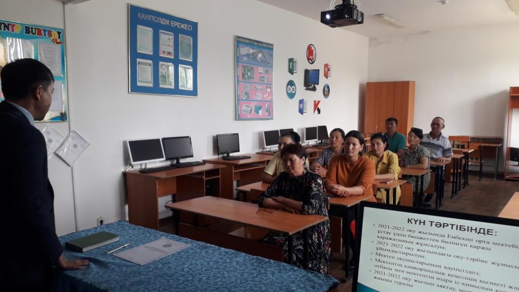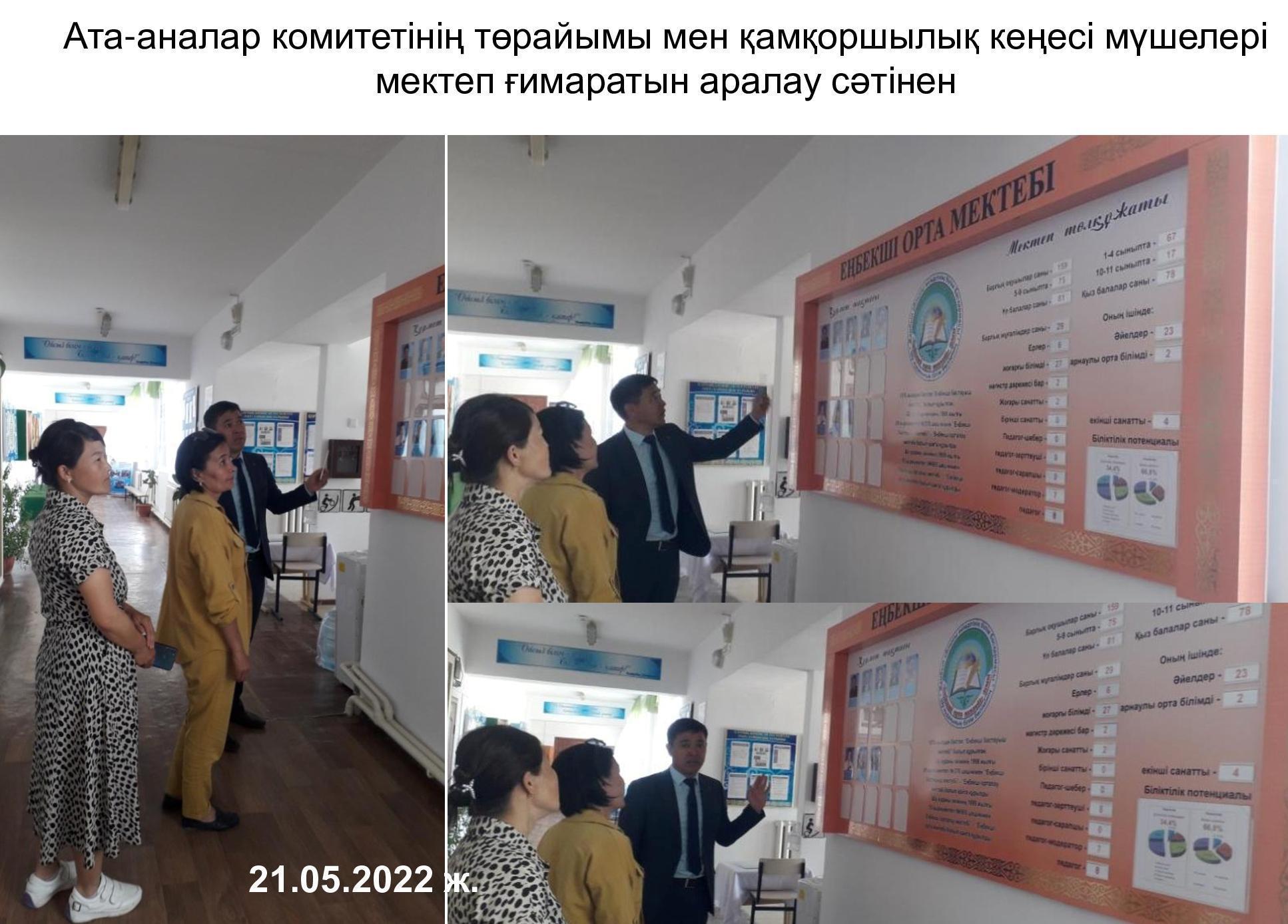 Еңбекші орта мектебінде 2022 жылдың 21 мамыр күні, сағат: 11.00-де мектеп директорының оқушылардың ата-аналары ұжымының алдында есеп беру кездесуі өткізілді. Кездесуге мектеп жанынан құрылған қамқоршылық кеңесінің мүшелері, Ескі-Шу ауылдық округінің жастар ісі жөніндегі инспекторы – Саулебаева Айгерім, мектептің ата-аналар комитетінің төрайымы – Жастықбаева Қарлығаш және сыныптар бойынша ата-аналар комитеттерінің төрайымдары мен мүшелері, ата-аналар қатысты.