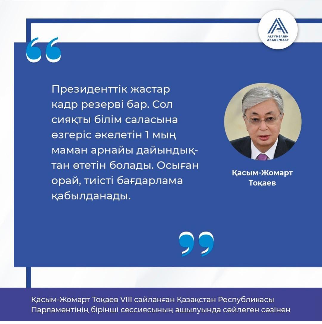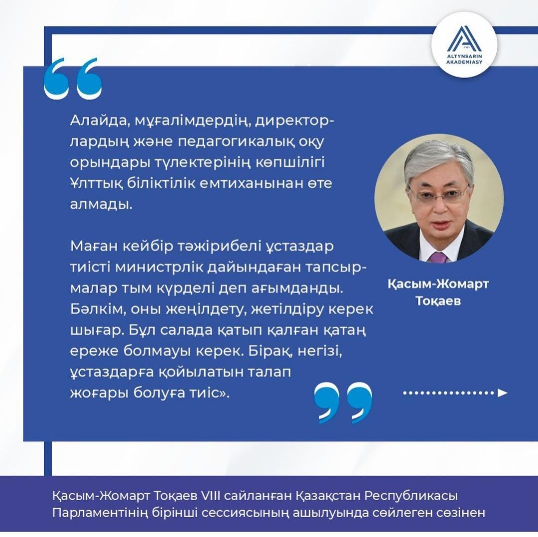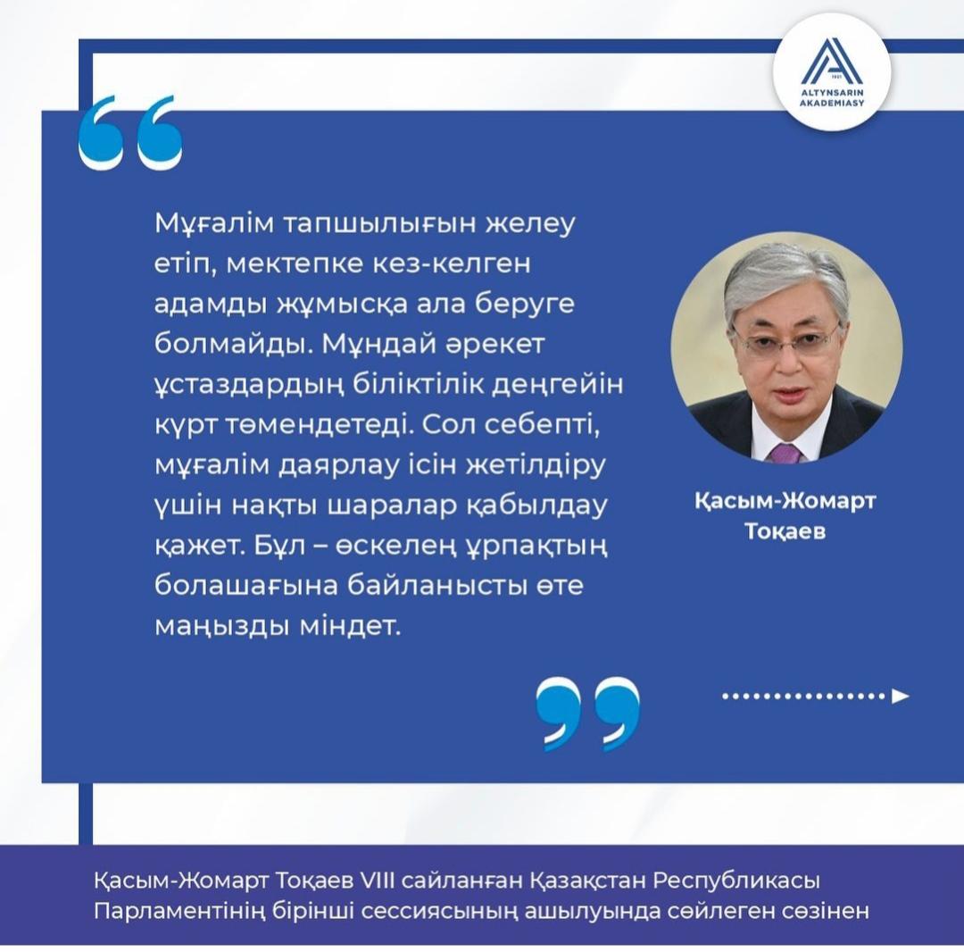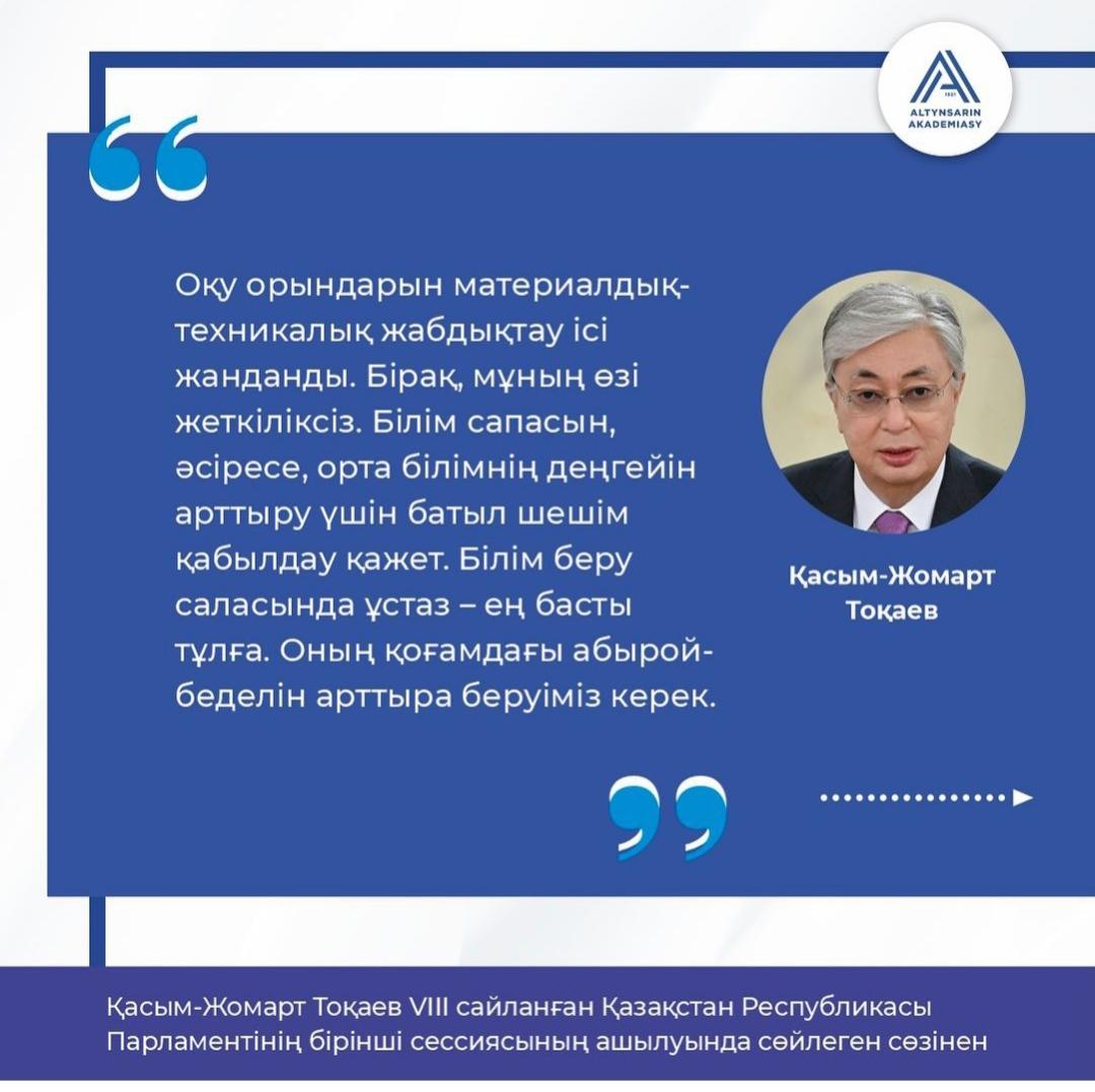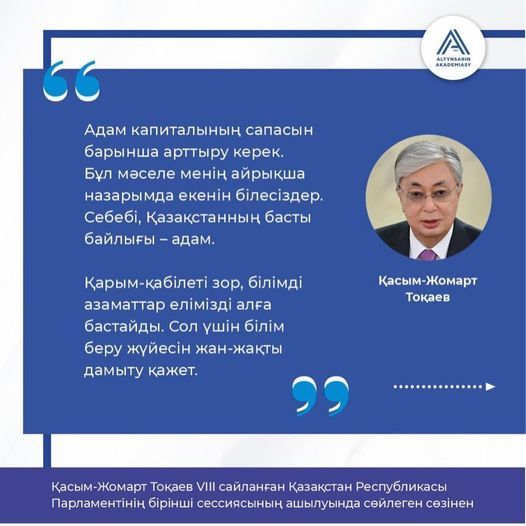 29 март 2023 0 1 2 3 4 5 Қасым-Жомарт Тоқаев VІІІ сайланған Қазақстан Республикасы Парламентінің бірінші сессиясының ашылуында сөйлеген сөзінен Дереккөзі: @altynsarin_akademiasy инстаграм парақшасынан