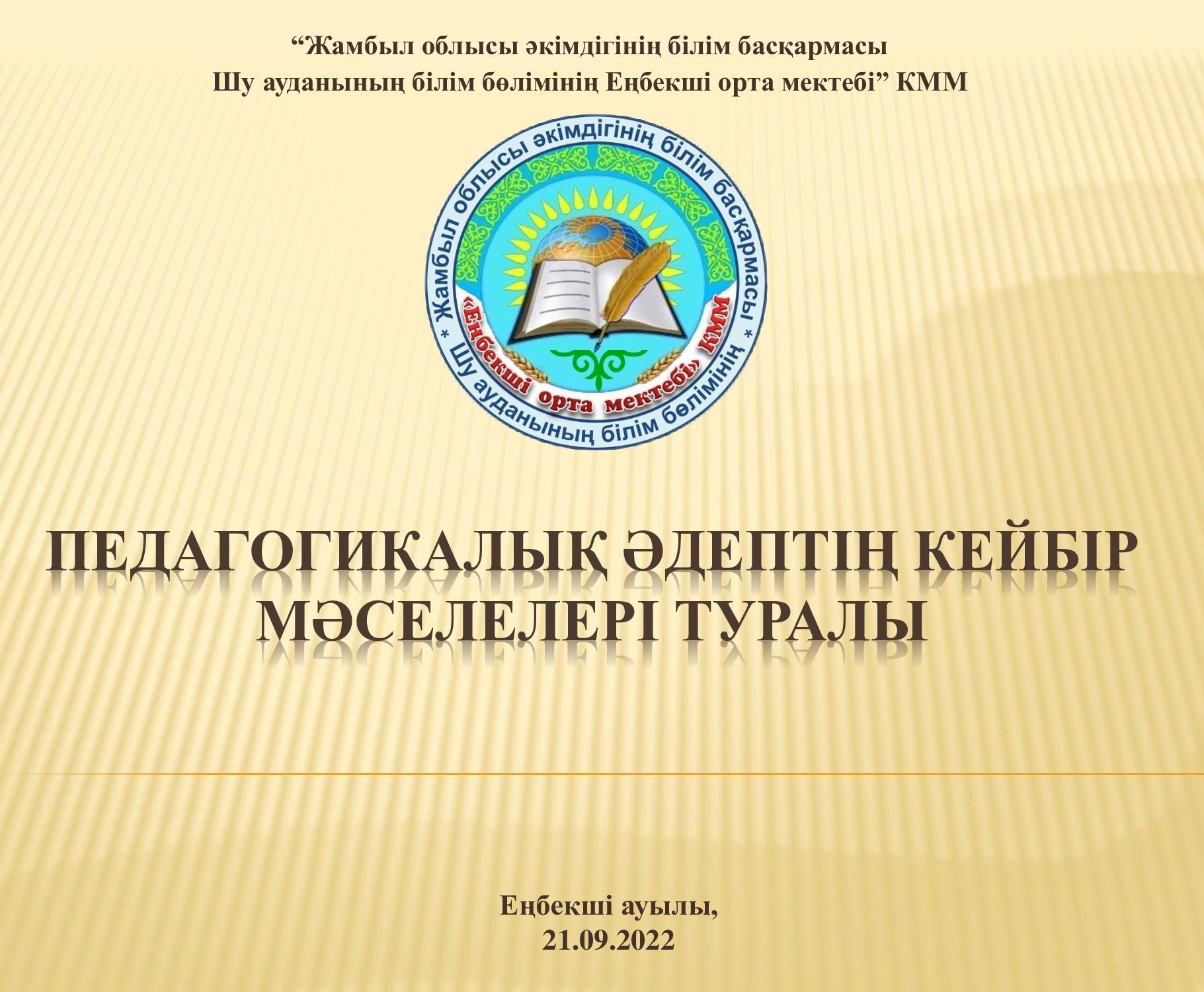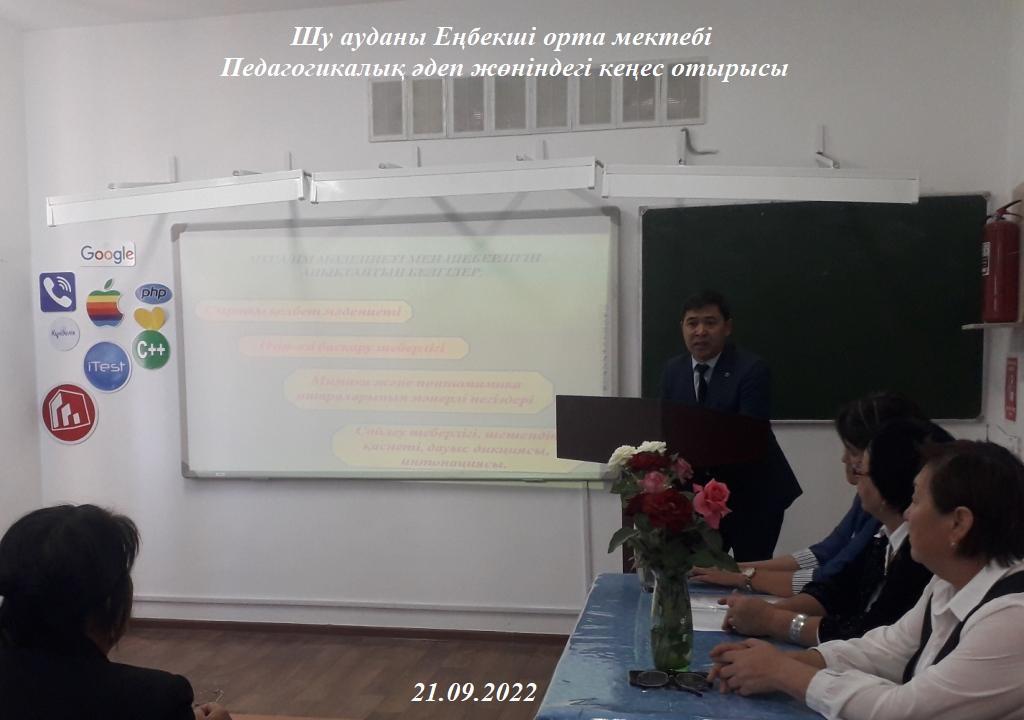 Шу ауданы Еңбекші орта мектебінде ағымдағы жылдың 21 қыркүйек күні, Қазақстан Республикасы Білім және ғылым министрінің 2020 жылғы 11 мамырдағы №190 «Педагогикалық әдептің кейбір мәселелері туралы» бұйрығын, Қазақстан Республикасының 2007 жылғы 27 шілдедегі №319 «Білім туралы» Заңының 5-бабының 34-1) тармақшасын, Қазақстан Республикасының 2019 жылғы 27 желтоқсандағы №293-VІ ҚРЗ «Педагог мәртебесі туралы» Заңының 5-бабының 3-тармағы мен 16-бабының 1-тармағын орындау мақсатында мектеп ұжымымен Педагогикалық әдеп жөніндегі кеңес отырысы өткізілді.